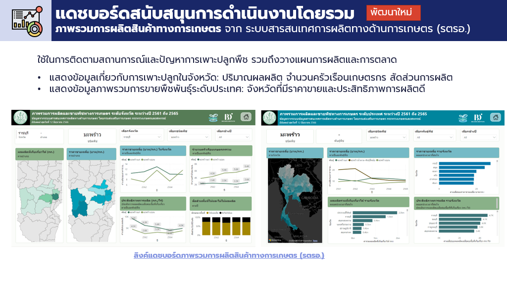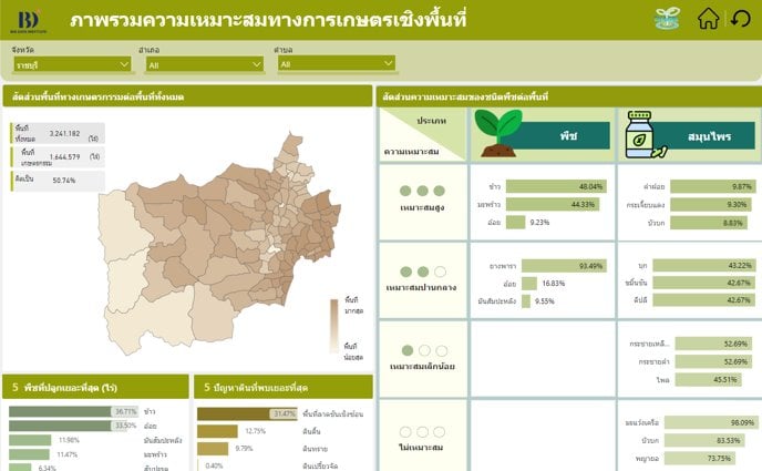 การพัฒนาแดชบอร์ดชิ้นนี้เป็นส่วนหนึ่งของความร่วมมือระหว่าง BDI กับ ศูนย์เทคโนโลยีอิเล็กทรอนิกส์และคอมพิวเตอร์แห่งชาติ (National Electronics and Computer Technology Center: NECTEC) เพื่อสนับสนุนการวิเคราะห์และใช้ประโยขน์ข้อมูลขนาดใหญ่ภาคการเกษตรบนแพลตฟอร์ม THAGRI ซึ่งได้เลือก จ.ราชบุรี เป็นพื้นที่นำร่อง มุ่งเน้นการส่งเสริมการปลูกมะพร้าวน้ำหอมของเกษตรกรใน จ.ราชบุรี ภายใต้โมเดลเศรษฐกิจชีวภาพ เศรษฐกิจหมุนเวียน และเศรษฐกิจสีเขียว (BCG Economy) เพื่อพัฒนาระบบการเกษตรของประเทศไทยสู่การเกษตร ประสิทธิภาพสูง มาตรฐานสูง และรายได้สูง