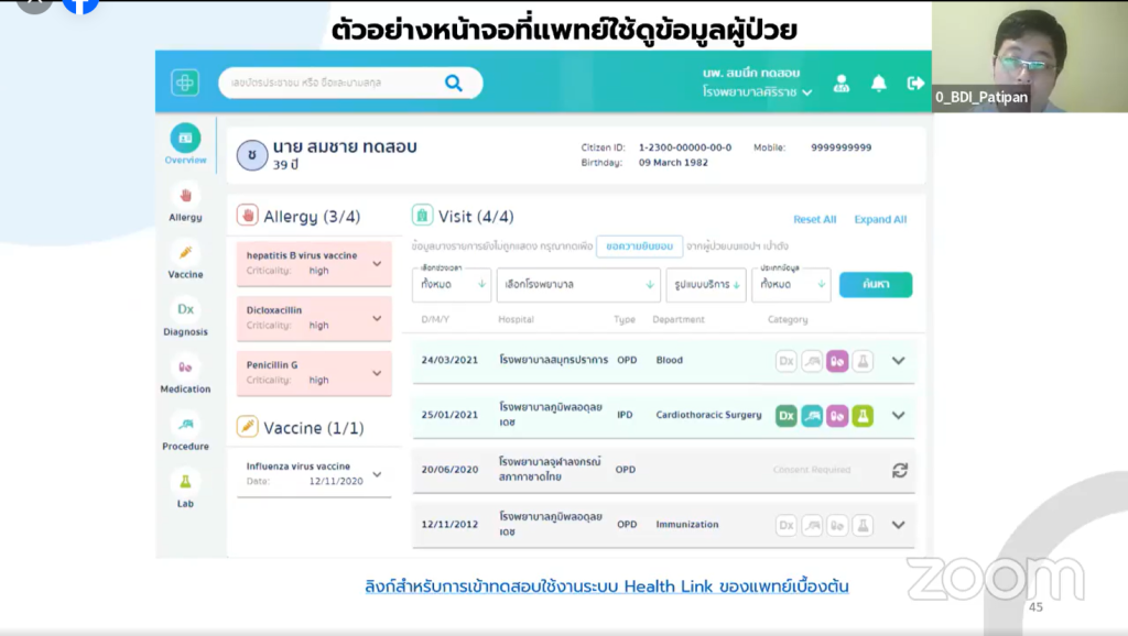 นายปฏิภาณ ประเสริฐสม ผู้เชี่ยวชาญด้านวิทยาศาสตร์ข้อมูล ฝ่ายบริการวิเคราะห์ข้อมูล BDI ร่วมกล่าวบรรยายในหัวข้อ “การประยุกต์ใช้ปัญญาประดิษฐ์ เพื่อทางการแพทย์” ว่า สิ่งสำคัญของการวิเคราะห์และใช้ประโยชน์ข้อมูล คือต้องมีโจทย์และความต้องการที่ชัดเจน แล้วจึงเก็บรวบรวมและเลือกใช้ข้อมูลที่ตอบโจทย์และแก้ปัญหาในการทำงานได้จริง โดยข้อมูลจะต้องมีคุณภาพและปริมาณเพียงพอแก่การใช้งาน ทั้งนี้ จุดเริ่มต้นที่ดีที่สุดคือการบริหารจัดการข้อมูลในองค์กรของตน จากนั้นจึงขยายไปสู่กลไกการแลกเปลี่ยนข้อมูลที่เป็นมาตรฐาน เพื่อให้บริการผู้ใช้งานนำข้อมูลไปประยุกต์ใช้ให้เกิดประโยชน์ได้อย่างสูงสุด เช่น โครงการ Health Link เป็นแพลตฟอร์มเชื่อมโยงข้อมูลสุขภาพระหว่างสถานพยาบาลทั่วประเทศ ช่วยให้แพทย์สามารถดูประวัติการรักษาได้ทันที จึงวินิจฉัยและวางแผนการรักษาได้อย่างรวดเร็วและแม่นยำ โดยผู้ป่วยไม่จำเป็นต้องเดินทางไปร้องขอสำเนาประวัติจากโรงพยาบาลเดิม