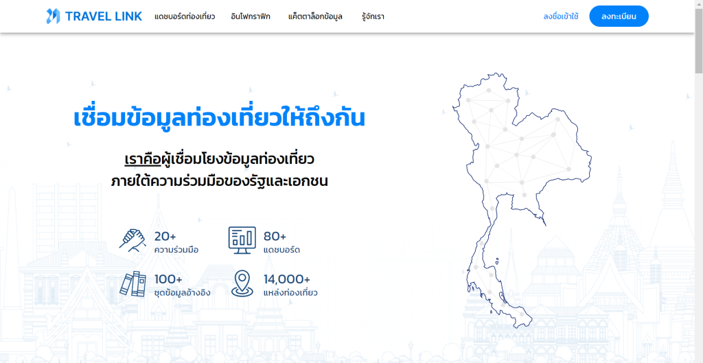 สำหรับ Travel Link เป็นแพลตฟอร์มที่รวบรวมและวิเคราะห์ข้อมูลด้านการท่องเที่ยวจากความร่วมมือกับพันธมิตรทั้งจากภาครัฐ ภาคเอกชน รวมไปถึงข้อมูลที่มีการดึงจากเว็บไซต์ต่าง ๆ เช่น สำนักงานตรวจคนเข้าเมือง กรมการปกครอง กระทรวงการท่องเที่ยวและกีฬา การท่องเที่ยวแห่งประเทศไทย ฯลฯ เพื่อนำมาพัฒนาและเผยแพร่ในรูปแบบแดชบอร์ด (Dashboard) และ อินโฟกราฟิก (Infographic) ที่หลากหลาย เพื่อตอบสนองความต้องการของหน่วยงานและผู้ประกอบการด้านการท่องเที่ยวที่ใช้ประโยชน์จากข้อมูลที่เป็นเอกภาพ
