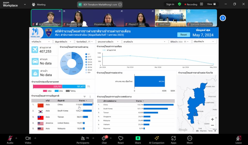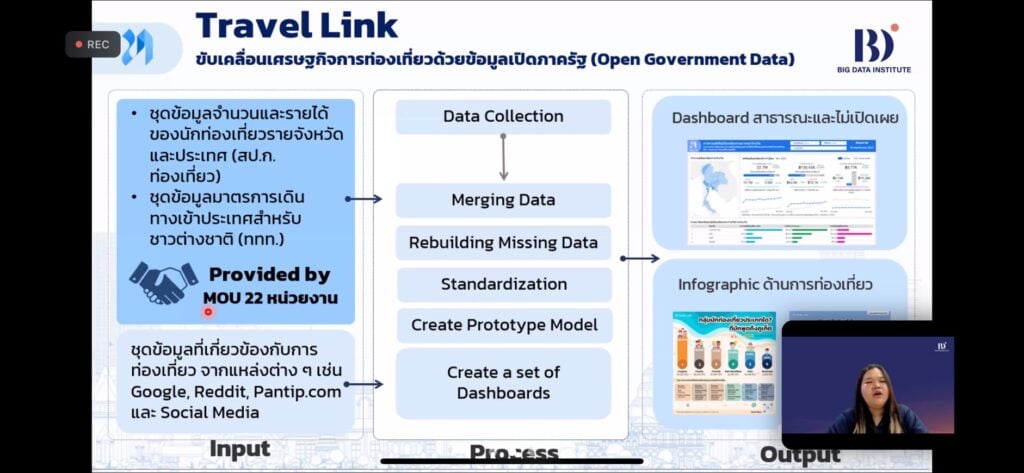 หลังจากนั้น เจ้าหน้าที่โครงการ TRAVEL LINK ได้แนะนำเกี่ยวกับแพลตฟอร์มดังกล่าวว่า TRAVEL LINK คือ แพลตฟอร์มเชื่อมข้อมูลท่องเที่ยวให้ถึงกัน ภายใต้ความร่วมมือของรัฐและเอกชนมากกว่า 20 หน่วยงาน เพื่อขยายขีดความสามารถ และการแข่งขันให้อุตสาหกรรมท่องเที่ยวของไทย ซึ่งจะมีแดชบอร์ดข้อมูลท่องเที่ยวมากกว่า 150 แดชบอร์ด ครอบคลุมกว่า 40 จังหวัดทั่วประเทศ โดยรวบรวมข้อมูลการเดินทาง การพักแรม การใช้จ่าย และกระแสจากสื่อโซเชียล ทำให้ทราบถึงการแสดงความคิดเห็นของนักท่องเที่ยว จำนวนผู้มาเยี่ยมเยือน เส้นทางบิน สถิติผู้โดยสารผ่านสนามบิน หรือด่านต่าง ๆ ทั่วประเทศ แล้วนำมาวิเคราะห์พร้อมแสดงสถิติผ่านอินโฟกราฟิก ที่อัปเดตรายวันและรายเดือน ซึ่งจะทำให้เห็นภาพรวมของข้อมูลได้ง่ายขึ้น สามารถช่วยผู้ประกอบการในการตัดสินใจและแก้ไขปัญหาได้ดียิ่งขึ้น