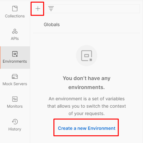 - กดเลือก Environments ที่ฝั่งซ้ายของโปรแกรม จากนั้นกดที่สัญลักษณ์รูปบวก หรือกดที่ข้อความ ‘Create a new Environment’ เพื่อสร้าง environment ใหม่