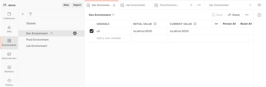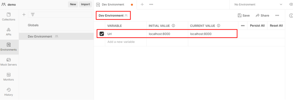 - ตั้งชื่อ environment ของเรา และตั้งค่าตัวแปร โดยในตัวอย่างจะใช้ environment นี้สำหรับการพัฒนา จึงตั้งชื่อว่า Dev Environment และตั้งค่าตัวแปรชื่อ URL ไว้เก็บลิงก์ที่ใช้ในการทดสอบ API โดยในตัวอย่างจะใช้เป็น localhost:8000