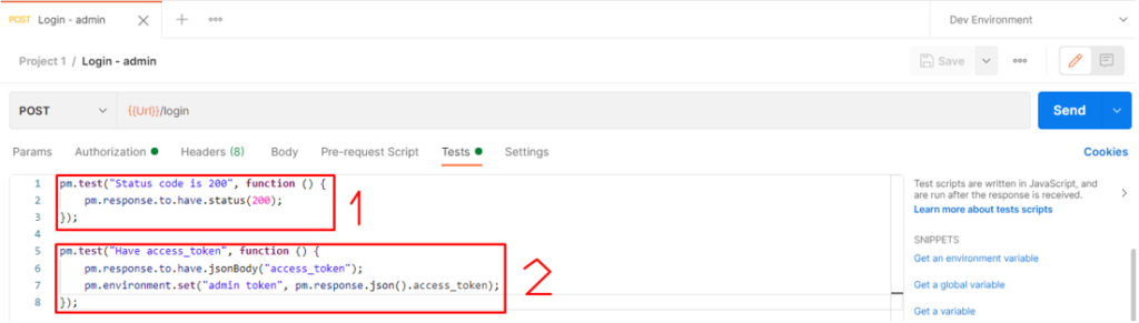 เราสามารถเขียน script เพื่อทดสอบ response ที่ได้รับกลับมาว่า status code หรือเนื้อหาตรงตามที่เราต้องการไหม และยังสามารถตั้งค่าที่ส่งกลับมาเป็นตัวแปร environment ได้อีกด้วย เช่น ในรูปตัวอย่างด้านล่าง จะมีการทำงานอยู่ 2 ส่วน คือ