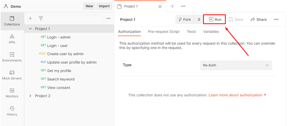 หากเราเขียน script test ครบทุก API เราจะสามารถ run ทดสอบ โดยสามารถเลือกเป็นทั้ง collection หรือเลือกเป็น folder ย่อยได้เช่นกัน โดยกดเลือก folder หรือ collection ที่ต้องการ จากนั้นกดปุ่มที่เขียนว่า Run