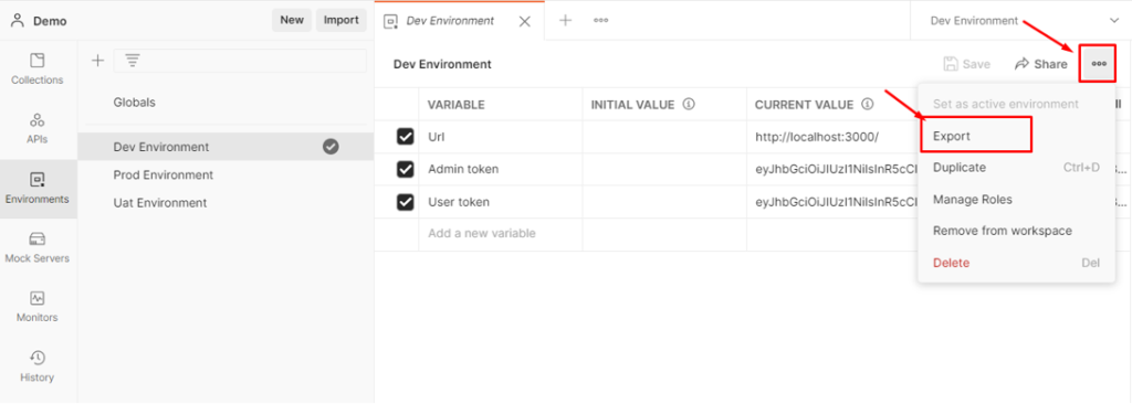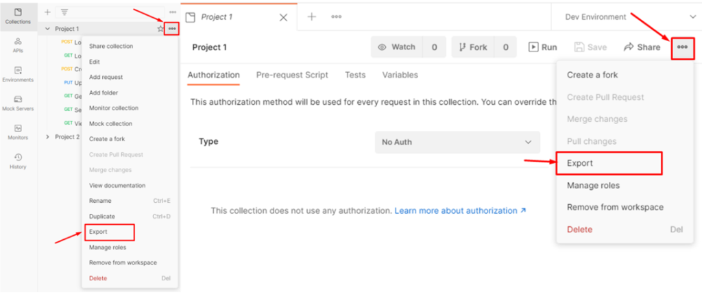 Collections และ Environments นั้น สามารถที่จะ export ออกมาเป็นไฟล์ เพื่อนำไปแชร์ให้คนอื่นต่อ หรือนำเข้า version control หรือจะ sync กับบัญชีแล้วใช้งานร่วมกับทีมได้เลย แต่จะมีจำกัดจำนวน API ที่แชร์ได้ หากต้องการมากกว่าที่กำหนดจะต้องเสียเงินเพิ่ม วิธีการสามารถทำได้โดยกดที่สัญลักษณ์จุด 3 จุดที่ collection หรือ environment ที่ต้องการ และเลือก export ได้เลย
