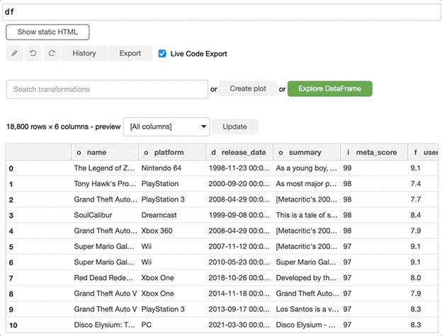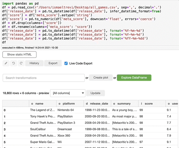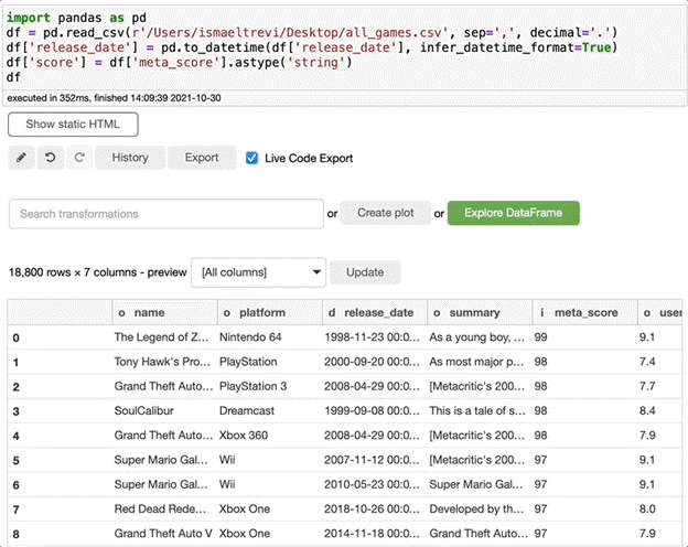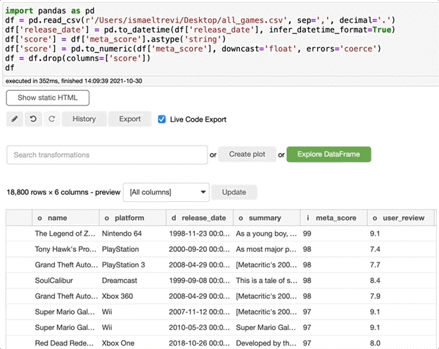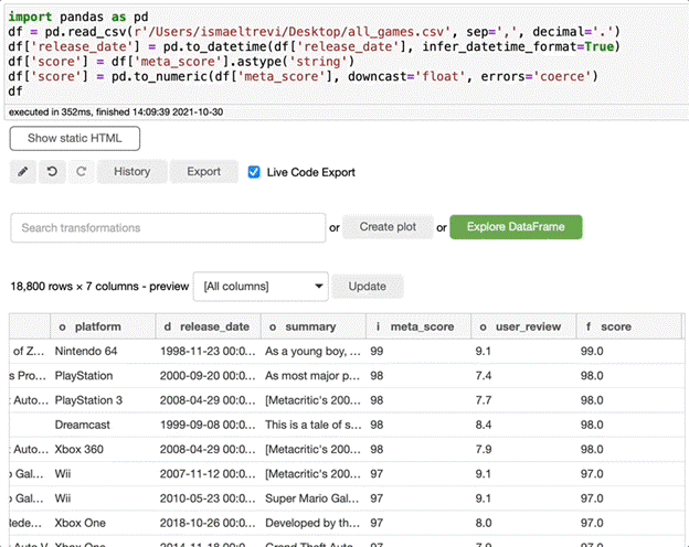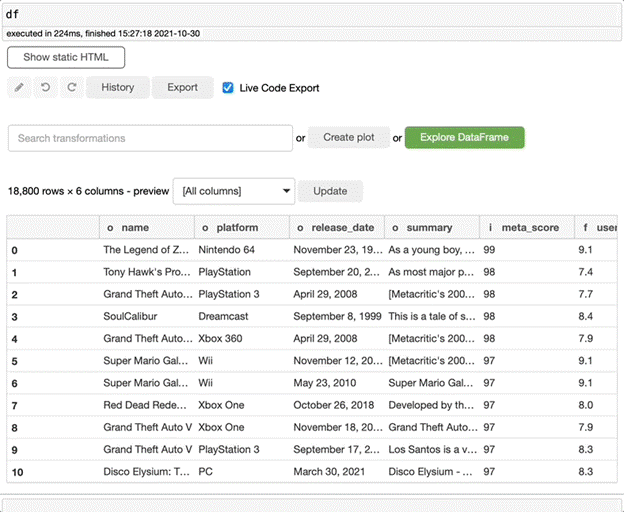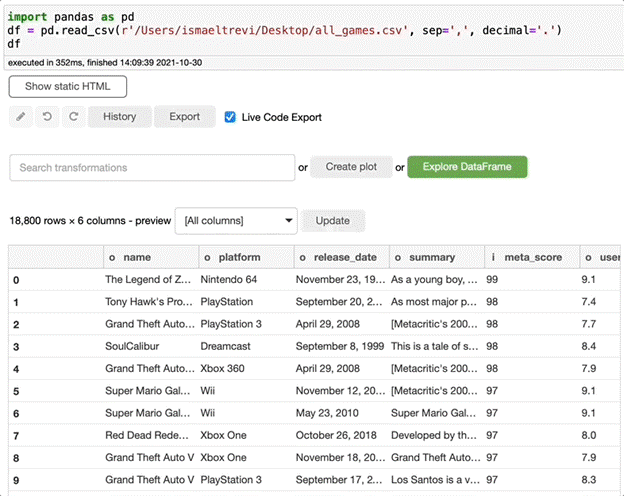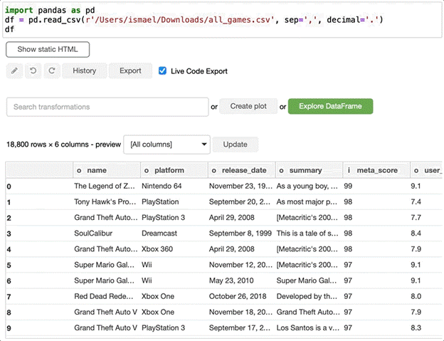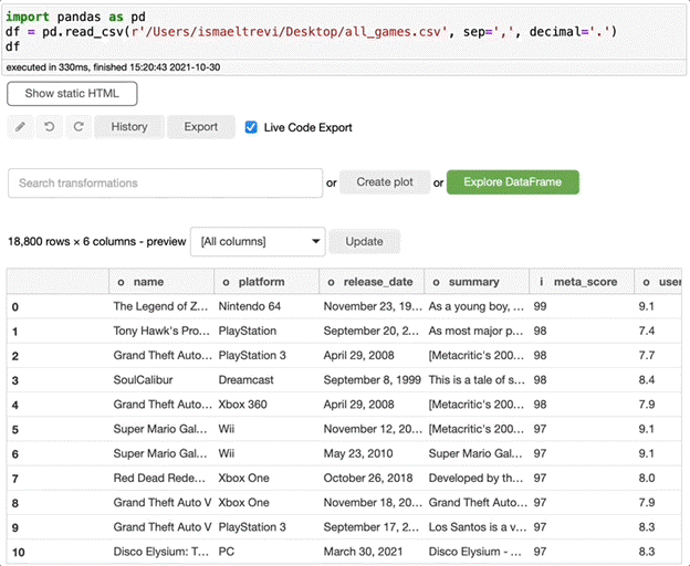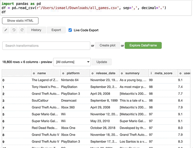 การติดตั้ง Bamboolib นั้นง่ายมาก คุณสามารถพิมพ์คำสั่ง pip install bamboolib ในหน้า Terminal ของคุณได้เลย หลังจากนั้น คุณสามารถนำเข้าไปยัง Jupyter Notebook ด้วยการพิมพ์ import bamboolib as bam เพื่อเริ่มต้นใช้งาน เราจะใช้ชุดข้อมูลยอดขายวิดีโอเกมส์จาก Kaggle All Video Games Sales เป็นตัวอย่างในบทความนี้ ทั้งนี้คุณสามารถที่จะใช้ข้อมูลอะไรก็ได้ตามที่คุณชอบ หลังจากดาวน์โหลดชุดข้อมูลของคุณแล้ว เรามานำเข้ามันและนั่นคือเราสามารถเริ่มใช้ Bamboolib ได้แล้ว.