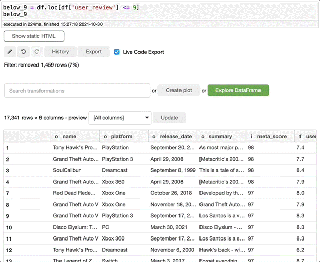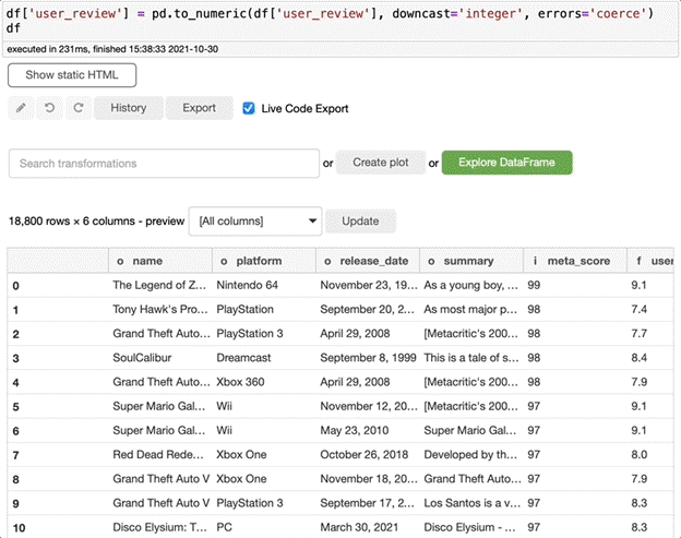 จากที่ก่อนหน้านี้เคยกล่าวถึง ตัวอักษรเล็ก ๆ ที่อยู่ข้างชื่อคอลัมน์นั้นคือลักษณะข้อมูลของคอลัมน์นั้น ๆ ถ้าคุณสังเกตลักษณะข้อมูลของคอลัมน์ user_review คุณจะเห็นว่าลักษณะข้อมูลแสดงเป็น f ซึ่งในที่นี้ f หมายถึง ข้อมูลชนิดตัวเลขทศนิยม (Float) แทนที่จะเป็น i ที่เป็นจำนวนเต็ม (Integer) แม้ว่าเราจะได้ทำการเปลี่ยนลักษณะของข้อมูลจาก object มาเป็นจำนวนเต็มแล้วก็ตาม นั่นเพราะว่า Bamboolib เข้าใจว่าลักษณะของข้อมูลเป็นข้อมูลชนิดตัวเลขทศนิยม ดังนั้นเพื่อไม่ให้เกิดข้อผิดพลาด มันจึงแก้ไขอัตโนมัติให้คุณนั่นเอง