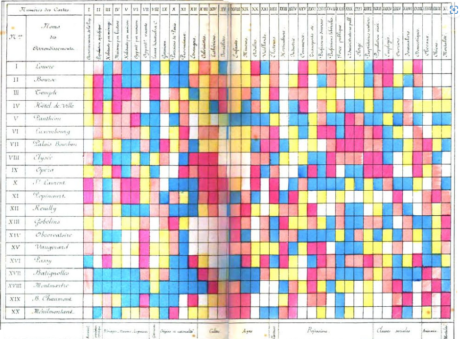 ตัวอย่างสำคัญที่มีการใช้แผนภูมิความร้อนนี้ถูกทำขึ้นโดย Toussaint Loua ในปี 1873 เพื่อติดตามค่าสถิติทางสังคม เช่น เชื้อชาติ ต้นกำเนิด อายุ ในปารีส ทั้งนี้ในแผนภูมิความร้อนนี้ประกอบไปด้วยเขตพื้นที่รายแถวของปารีสเทียบกับค่าสถิติทางสังคมกว่า 30 ค่า โดยใช้สีทั้งหมด 4 สี คือ สีขาว สีน้ำเงิน สีเหลือง และ สีแดง ในการบ่งบอกถึงค่าต่าง ๆ แทนตัวเลข