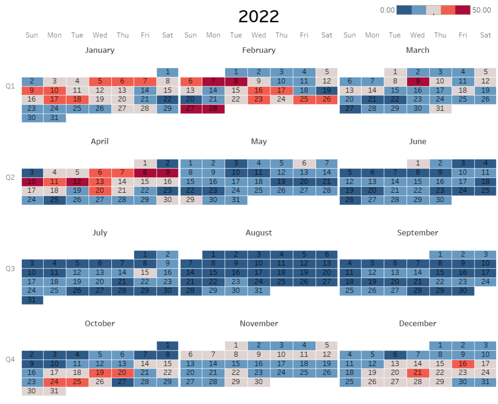 จากข้อมูลที่ผู้เขียนนำมาใช้แสดงในแผนภูมิปฏิทินนี้ สามารถสังเกตได้ว่าในช่วงเดือนพฤษภาคมจนถึงกลางเดือนตุลาคมมีปริมาณค่าฝุ่น PM2.5 ที่ค่อนข้างน้อยเมื่อเทียบกับเดือนอื่นๆ ซึ่งในช่วงต้นปีที่มีการเปลี่ยนฤดูเป็นฤดูหนาว เช่น เดือนมกราคมและเดือนกุมภาพันธ์จะมีค่า PM2.5 ที่ค่อนข้างสูง และในส่วนท้ายปีเดือนพฤศจิกายนและเดือนธันวาคมเริ่มมีแนวโน้มการเพิ่มขึ้นของปริมาณฝุ่น PM2.5 ซึ่งมีความน่าจะเป็นที่จะลามไปถึงเดือนมกราคมและเดือนกุมภาพันธ์ในปี 2023