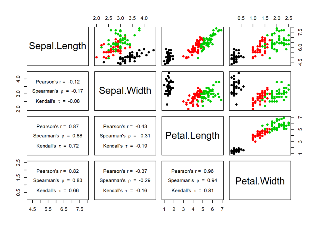 ค่า Kendall Correlation เป็นการหาความสัมพันธ์ระหว่างตัวแปร 2 ตัวที่อยู่ในมาตราการวัดระดับ Ordinal Scale โดยค่า Kendall Correlation จะมีค่าอยู่ระหว่าง -1.0 ถึง +1.0 เช่นเดียวกับ ค่า Pearson Correlation และ ค่า Spearman Correlation ส่วนการแปลความหมายก็ไม่ต่างจากการแปลความหมายของค่า Pearson Correlation และ ค่า Spearman Correlation นั้นคือ หากค่า Kendall Correlation ใกล้ -1.0 นั้นหมายความว่าตัวแปรทั้งสองตัวมีความสัมพันธ์กันอย่างมากในเชิงตรงกันข้าม หากค่า Kendall Correlation ใกล้ +1.0 นั้นหมายความว่า ตัวแปรทั้งสองมีความสัมพันธ์กันอย่างมากในทิศทางเดียวกัน และหากค่า Kendall Correlation เป็น 0 นั้นหมายความว่า ตัวแปรทั้งสองตัวไม่มีความสัมพันธ์ต่อกัน อย่างไรก็ตาม ค่า Kendall Correlation จะสามารถใช้ในการบ่งบอกถึงระดับความเข้มข้น (strength) ของความสัมพันธ์ระหว่างตัวแปรทั้งสองได้ดีกว่าค่า Pearson Correlation และ ค่า Spearman Correlation[1] ดังนั้นโดยปกติค่า Kendall Correlation จะน้อยกว่า ค่า Pearson Correlation และ ค่า Spearman Correlation เสมอ (โปรดดูภาพที่ 2 ประกอบ)