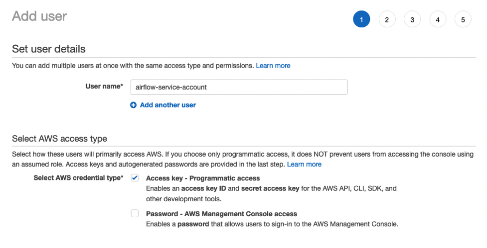 ถัดไปเราจะมาเริ่มแตะในส่วนของ Airflow กัน ซึ่งการที่จะให้ Airflow เชื่อมต่อไปยัง EMR ได้ เราจำเป็นต้องมี Service Account ก่อนครับ ดังนั้นเราจะไปสร้าง AWS User ขึ้นมา โดยให้เราไปที่ AWS Account ของเรา และตอนที่สร้าง User ให้เราเลือก Credential Type เป็น “Access Key – Programmatic Access”