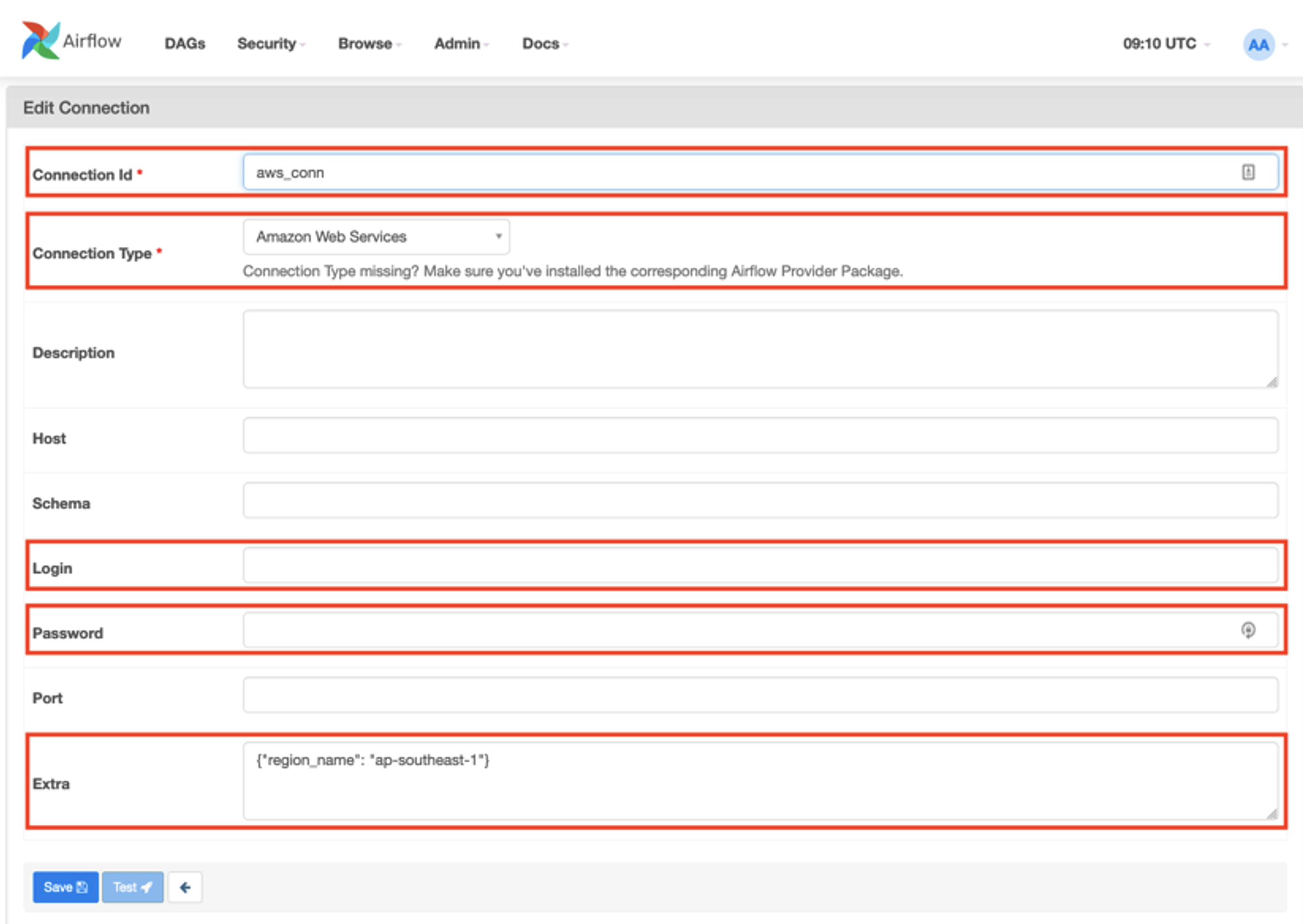 ถัดไปให้เราเข้าไปที่ Airflow และสร้าง Airflow Connection ขึ้นมา โดยตั้งชื่อ Connection Id ว่า aws_conn เลือก Connection Type เป็น Amazon Web Services ตรงช่อง Login ให้ใส่ Access Key ID และช่อง Password ให้ใส่ Secret Access Key ที่เราได้มาในขั้นตอนก่อนหน้านี้ และตรง Extra ให้กำหนด Region ลงไปด้วยตามนี้