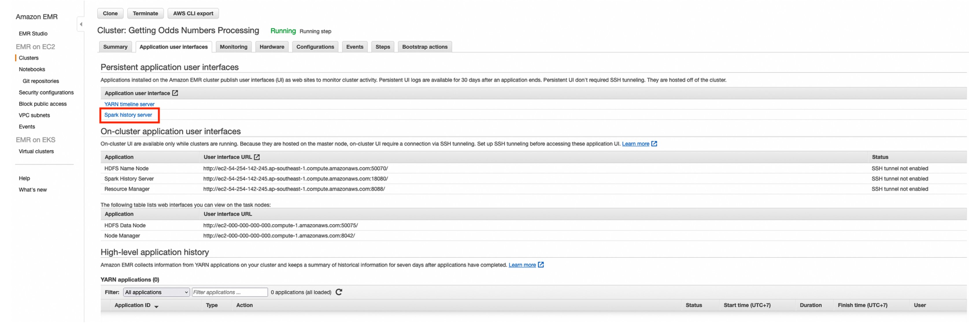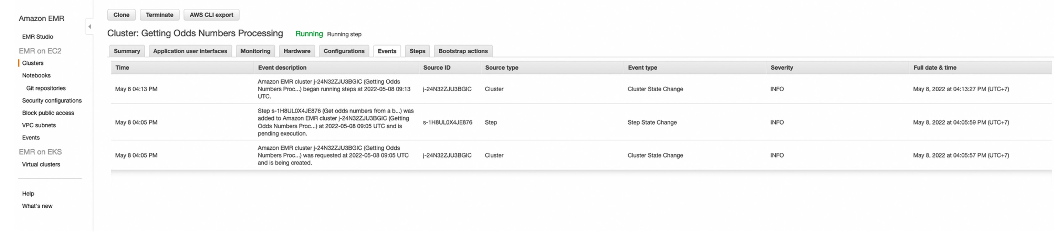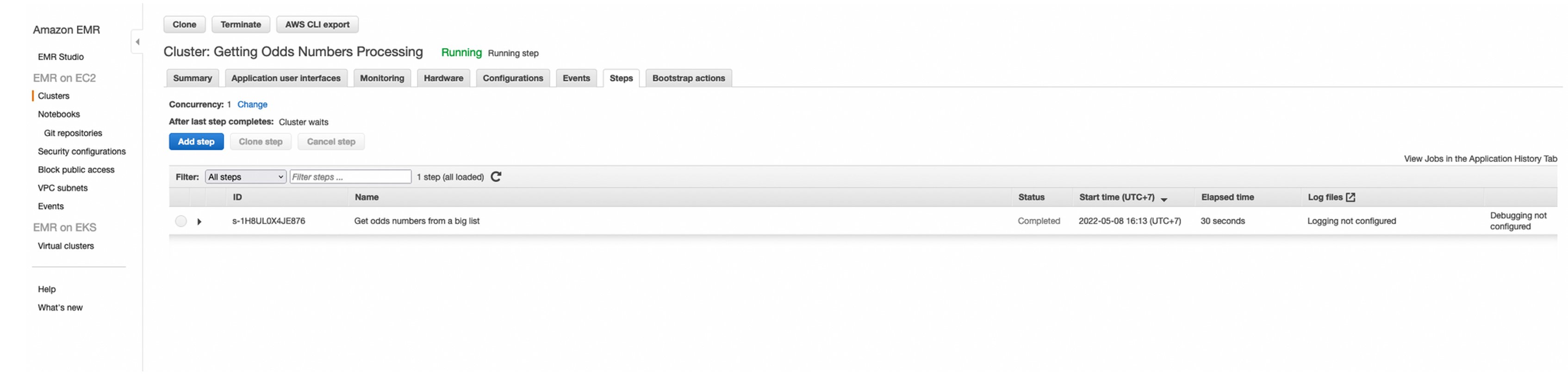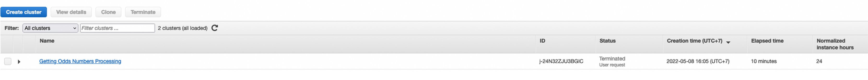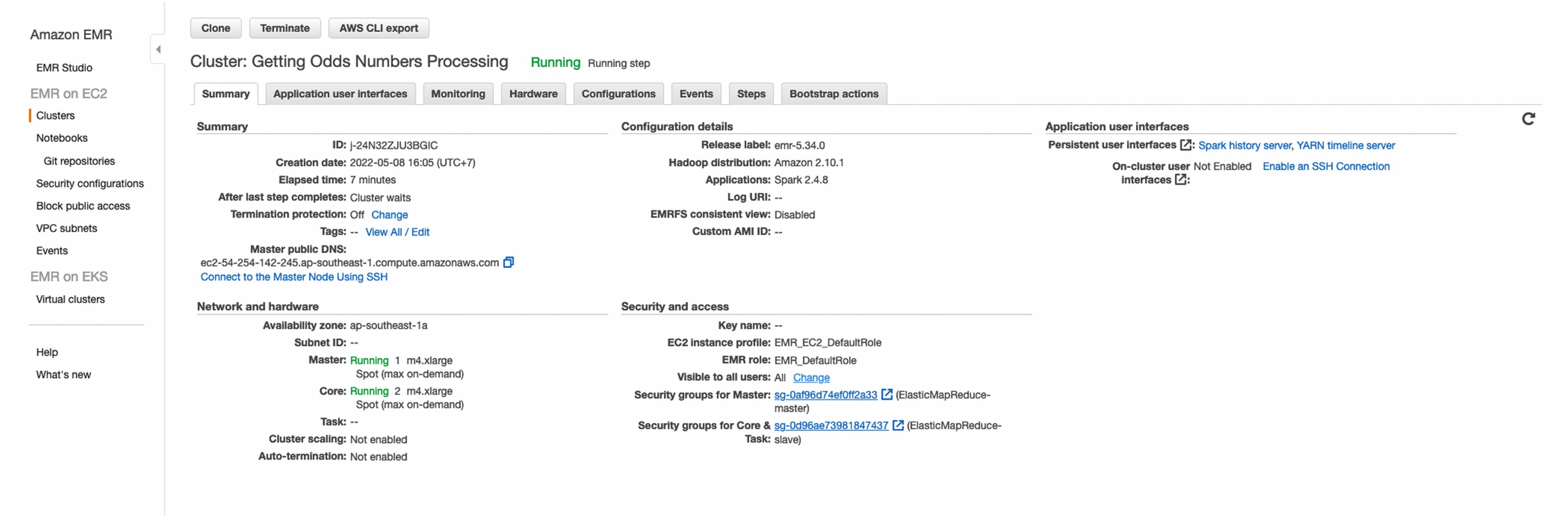 ถ้าเรากลับไปดูที่ AWS Account ของเรา แล้วเข้าไปที่ Amazon EMR เราจะเห็นว่ามี Cluster ที่ชื่อ “Getting Odds Numbers Processing” ได้ถูกสร้างขึ้นมาแล้ว!