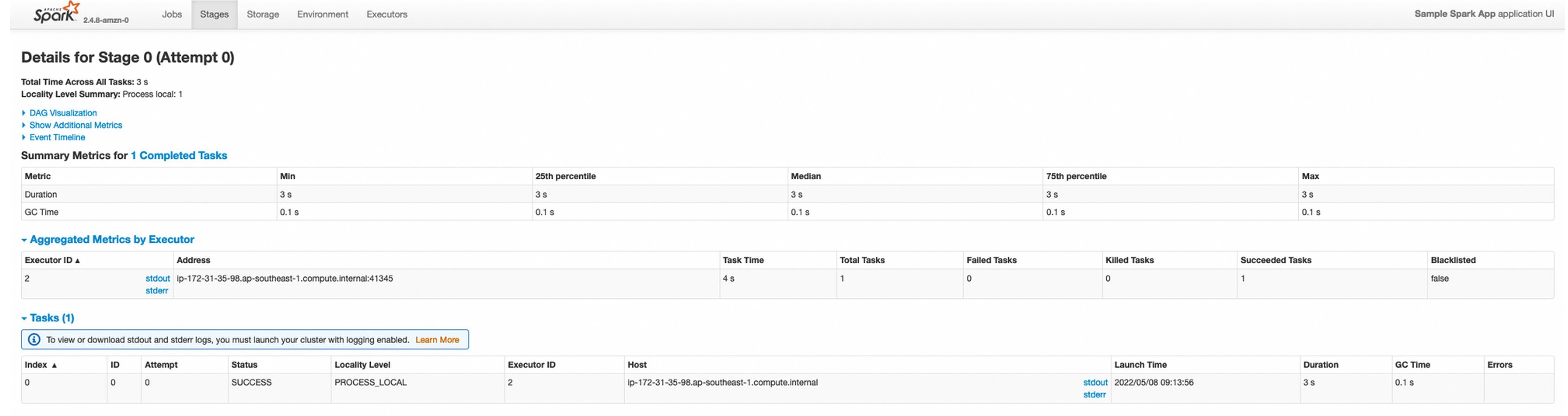 พอกดแล้วจะมีหน้าเว็บเด้งขึ้นมาอีกหน้าหนึ่ง ซึ่งเป็นหน้าเว็บของ Spark UI ครับ เราสามารถกดเข้ามาดูรายละเอียดของ Job ต่าง ๆ ที่เราส่งมาได้