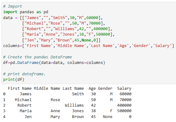 เริ่มต้นใช้งาน Pandas library โดยการ import library และสร้าง DataFrame ด้วยฟังก์ชัน pd.DataFrame โดยได้ผลลัพธ์ออกมาเป็นตารางที่มี index เริ่มที่ index 0