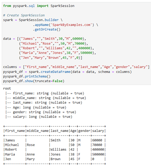 เริ่มต้นโดยการ import และสร้าง SparkSession และสร้าง DataFrame ด้วย spark.createDataFrame โดยได้ผลลัพธ์ออกมาเป็นตารางที่ไม่มี index และเมื่อต้องการแสดงตาราง ให้ใช้ฟังก์ชัน show()