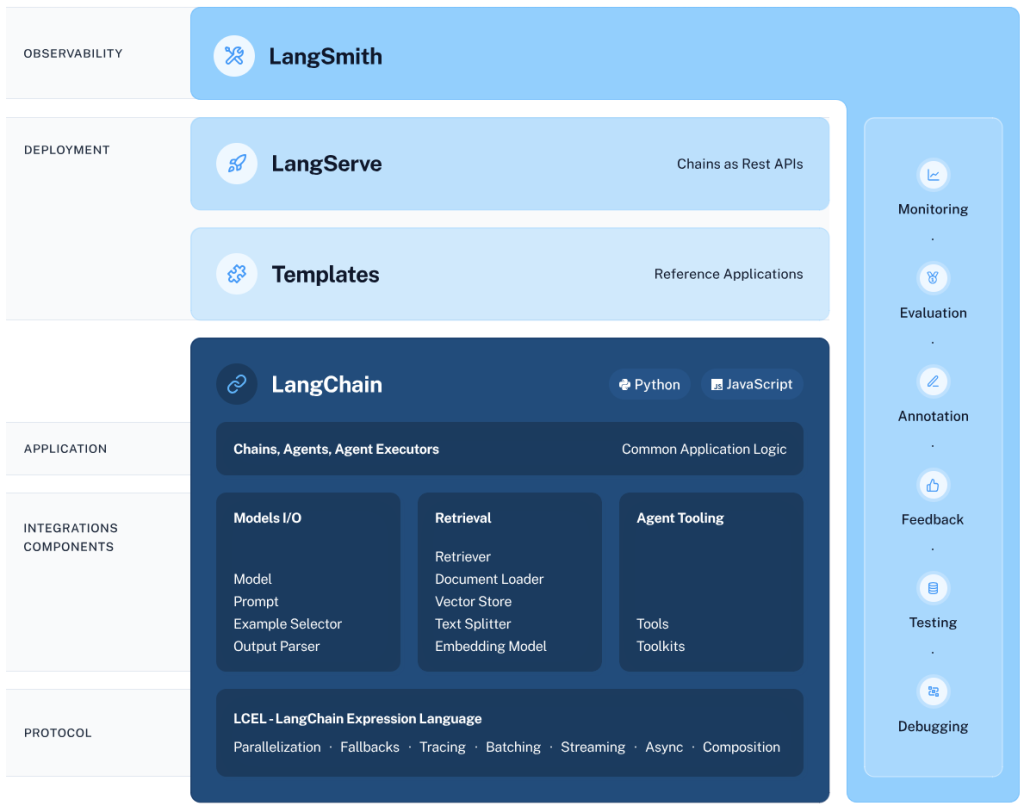 - LangSmith: แพลตฟอร์มสำหรับนักพัฒนาเพื่อใช้ในการปรับแต่งแอปพลิเคชันให้สมบูรณ์และทำงานได้อย่างราบรื่น โดยมีฟังก์ชันจำเป็นที่หลากหลาย อาทิ การติดตามสถานะการทำงาน (Monitoring) การประเมินผลการทำงาน (Evaluation) การทดสอบระบบ (Testing) และการแก้ไขจุดบกพร่อง (Debugging)