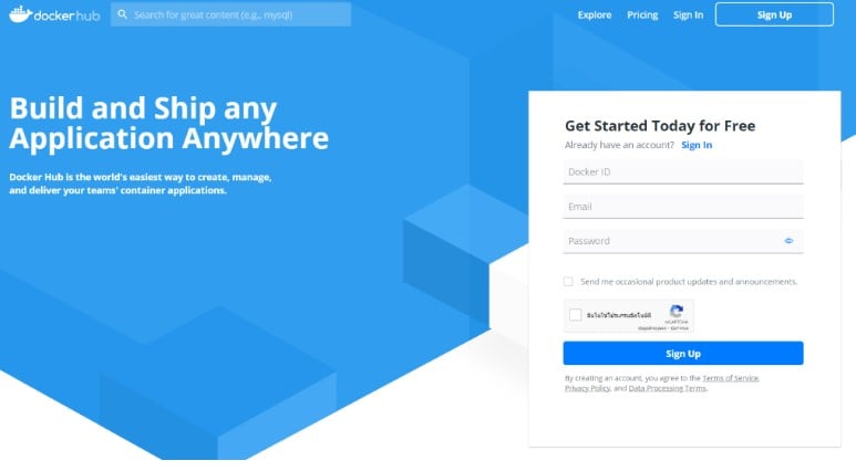 Docker Hub เปรียบเสมือนจุดศูนย์รวมของ Docker image ต่าง ๆ จากทั่วโลกที่กลุ่มคนใช้ Docker แชร์ Docker images ที่ตัวเองสร้างขึ้นให้กับคนทั่วไปได้ใช้นั้นเอง เป็นไงยังไงครับ ดูยิ่งใหญ่มาก ฮ่า ๆ เราสามารถเข้าไปดูได้ที่ เว็บไซต์ Docker Hub