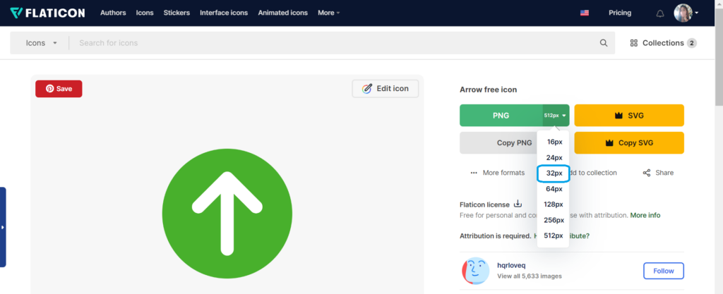 ก่อนอื่น เราสามารถค้นหาไอคอนที่ต้องการนำมาใช้งานได้จาก Flaticon ที่มีไอคอนฟรีมากมายให้เลือกใช้ โดยเลือกตัวเลือกการดาวน์โหลดเป็นไฟล์ PNG ขนาด 32px