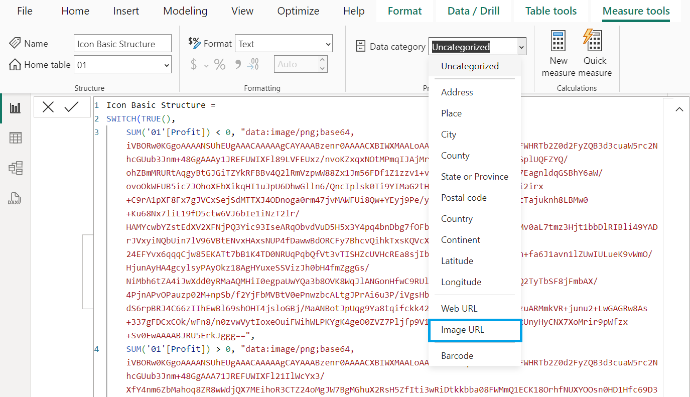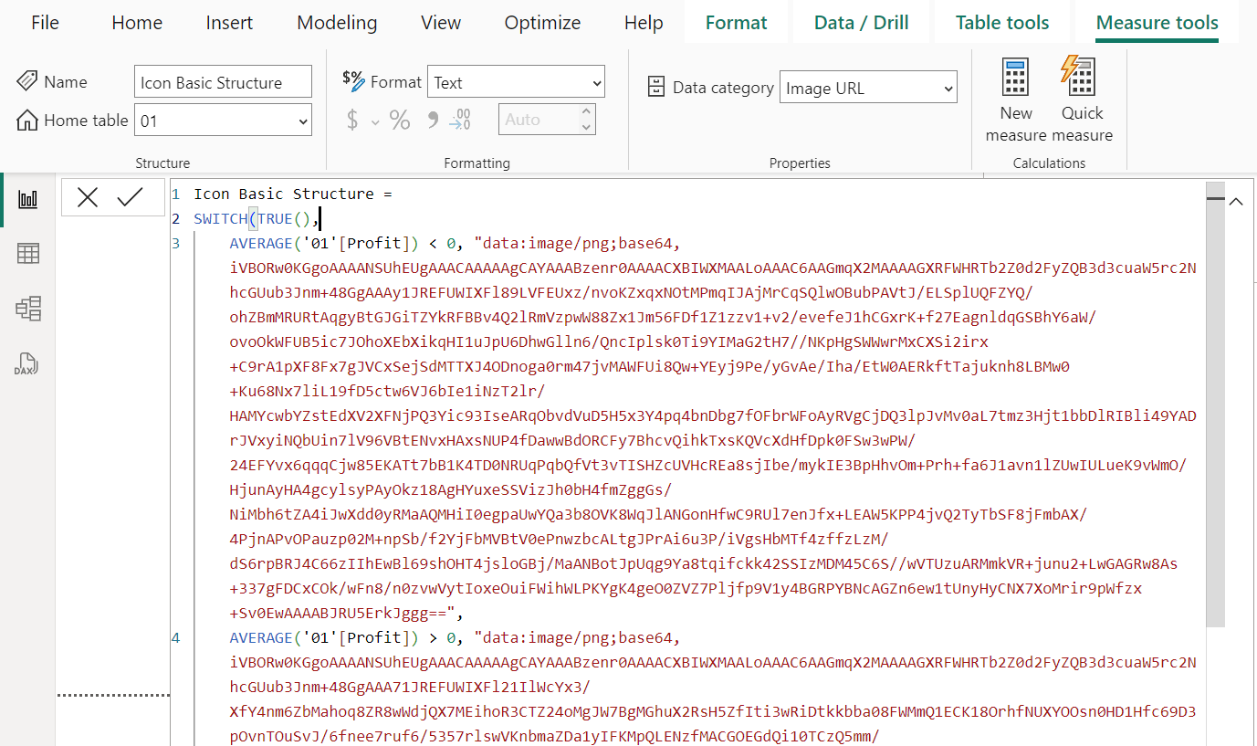 การนำเสนอดังกล่าวแสดงผลผ่าน Card (new) โดยทำการเพิ่มรูปภาพร่วมกับการแสดงผลของค่า ซึ่งการแสดงของไอคอนนั้นจะต้องสร้างสูตร (Measure) เพื่อระบุเงื่อนไขในการแสดงผล โครงสร้างสูตรเบื้องต้นมีส่วนประกอบดังรูปที่ 2 ภายใน “” จะต้องนำโค้ดของการแปลงไอคอนให้อยู่ในรูป image base64 เรียบร้อยแล้ว