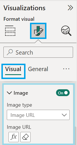สร้าง Card (new) โดยเลือกข้อมูลที่ต้องการแสดงผลมาใส่ ที่ Format visual ในเมนู Image เลือก Image type: Image URL ดังรูปที่ 7