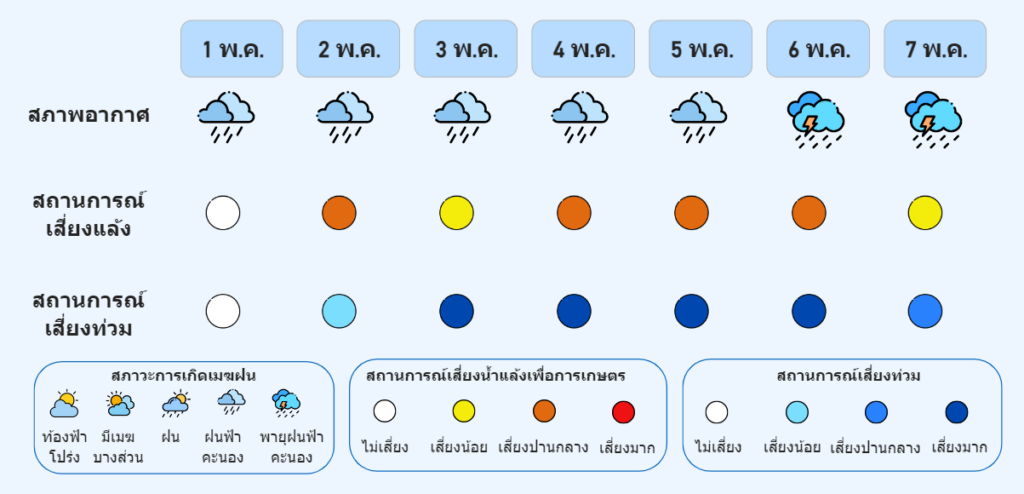 การแสดงผลสภาพอากาศมักถูกแสดงด้วยไอคอนที่เกี่ยวกับเมฆและฝน ดังแสดงในรูปที่ 8 จะเป็นการแสดงผลสภาพอากาศ 7 วันด้วยการใช้ Dynamic icons ในกรณีที่มีการวิเคราะห์สถานการณ์เสี่ยงน้ำแล้งและน้ำท่วมสามารถแสดงผลความรุนแรงของความเสี่ยงด้วยสี อาจจะใช้เพียงจุดสีธรรมดาในการแสดงผล
