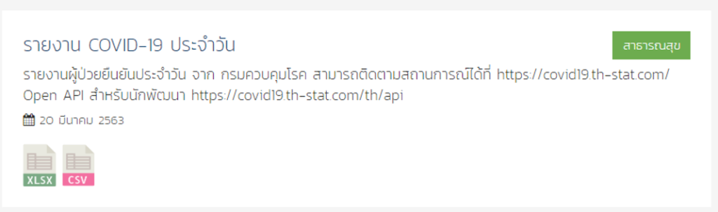 ตัวอย่างข้อมูลที่จะนำมาใช้ประกอบบทความนี้ เพื่อให้สอดคล้องกับในวิกฤตสถานการณ์โรคระบาดโควิด-19 คือ ข้อมูลจริงที่เผยแพร่อย่างเป็นทางการจากหน่วยงานรัฐ โดยที่ข้อมูลได้ถูกเผยแพร่ใน Platform ที่เรียกว่า Open Data บนเว็บไซต์ https://data.go.th/ ซึ่งเป็นช่องทางในการเผยแพร่ข้อมูลที่เป็นทางการของประเทศไทยจากภาครัฐสู่ภาคเอกชนและประชาชน ทั้งนี้ ข้อมูลที่มีการเผยแพร่เกี่ยวกับโรคโควิด-19 ได้แก่ ข้อมูล “รายงาน COVID-19 ประจำวัน” โดยมีรายละเอียดตามภาพด้านล่างนี้ ข้อมูลนี้สามารถเรียกออกมาใช้งานได้ผ่าน Restful API ซึ่งเป็นข้อมูลที่มีการปรับปรุงแบบรายวัน