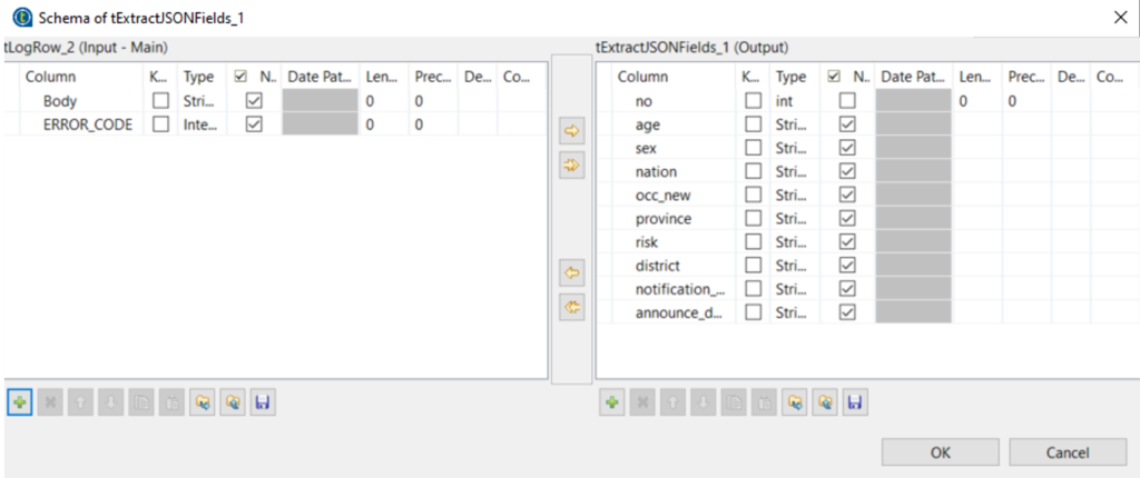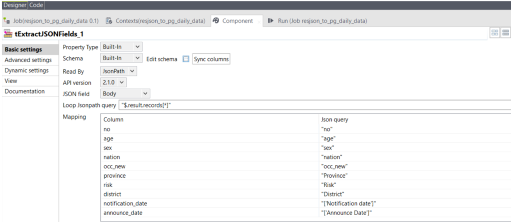 เนื่องจากข้อมูลที่ได้กลับมาจาก RESTful API นั้นจะมีส่วนของข้อมูลอื่นที่ไม่ใช้ส่วนข้อมูลที่เป็น record ที่เราจะจัดเก็บลงในฐานข้อมูลจึงจะต้องทำการ Extract JSON ออกมาให้อยู่ในรูปแบบ Column โดยให้ทำการ Config tExtractJSONFields_1 ตามภาพเพื่อทำการ Mapping ว่าจะได้ column อะไรออกมาบ้าง เมื่อกดดูที่ Edit schema ควรได้ fields list ตามภาพด้านล่างนี้