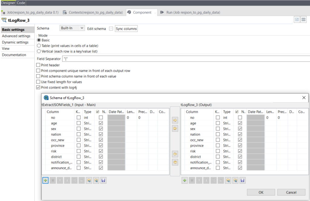 สำหรับ tLogRow3 นั้นเราใส่เพื่อให้เห็น fields ที่ออกจาก tExtractJSONFields_1 และจะไปเข้าที่ tMap_1ที่ต้อง Transform ข้อมูลเกี่ยวกับวันที่ “Notification date” และ “Announce Date”