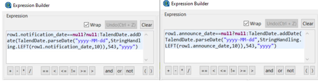 เนื่องด้วยข้อมูล field วันที่ “Notification date” และ “Announce Date” ที่รับมาจาก JSON นั้นไม่สามารถจัดเก็บลงในระบบฐานข้อมูลได้ตรง ๆ เนื่องด้วยจะทำให้มีการจัดเก็บข้อมูลปีผิด จึงต้องใช้ tMap_1 เข้ามาช่วยโดยการใช้ฟังก์ชันเพื่อแก้ไขข้อมูลปี โดยการ Config ตามภาพ