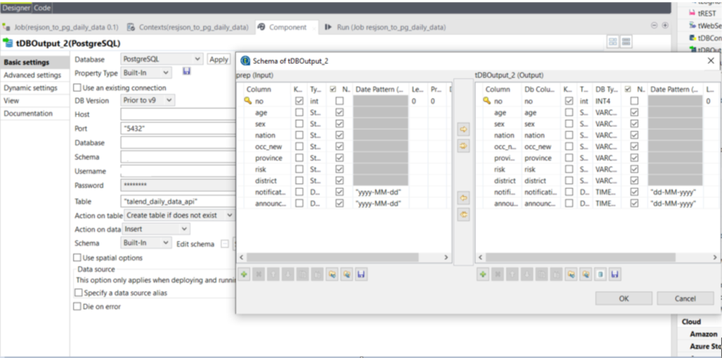 และสุดท้ายคือการเพิ่ม tDBOutput_2 เพื่อเขียนข้อมูลลงไปจัดเก็บในฐานข้อมูล PostgreSQL โดยให้กรอกข้อมูลการเชื่อมต่อฐานข้อมูลให้สมบูรณ์ ส่วนการ Edit Schema ให้ระวังว่าได้ใส่รูปแบบวันที่ให้ถูกต้องตามภาพ