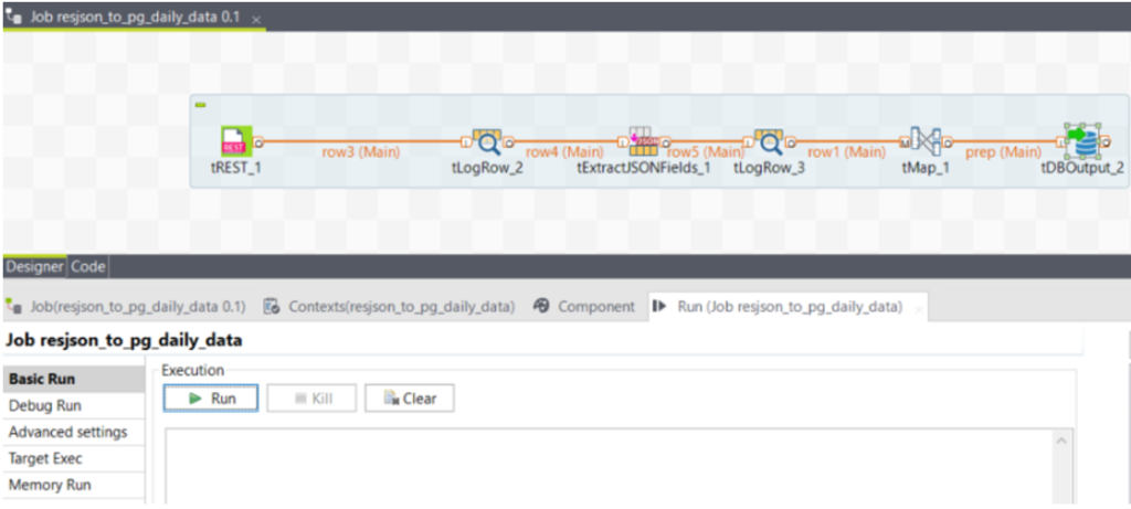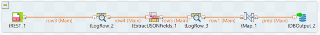 สำหรับวิธีการใช้เครื่องมือ Talend Software ที่เกริ่นไปก่อนหน้านี้ ท่านสามารถศึกษาข้อมูลใช้งานได้ที่ TOS 7.3 User Guide โดยภาพด้านล่างนี้เป็นตัวอย่างของ Flow ที่ใช้ในการดึงข้อมูลมาจาก DGA Restful API และเก็บข้อมูลลงระบบฐานข้อมูล PostgreSQL