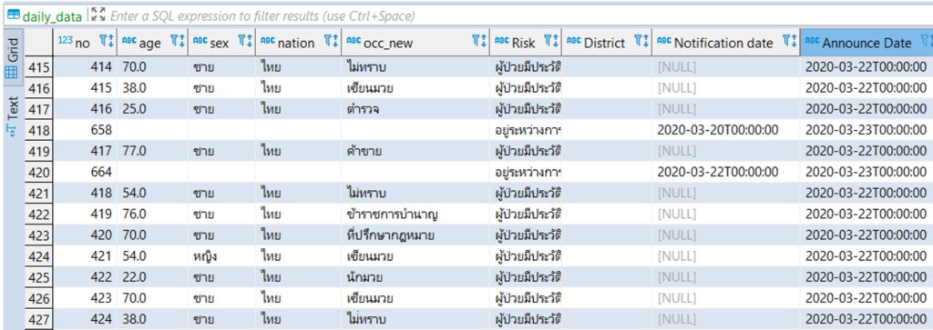 df = df[['no', 'age', 'sex', 'nation', 'occ_new', 'Risk', 'District', 'Notification date', 'Announce Date']]