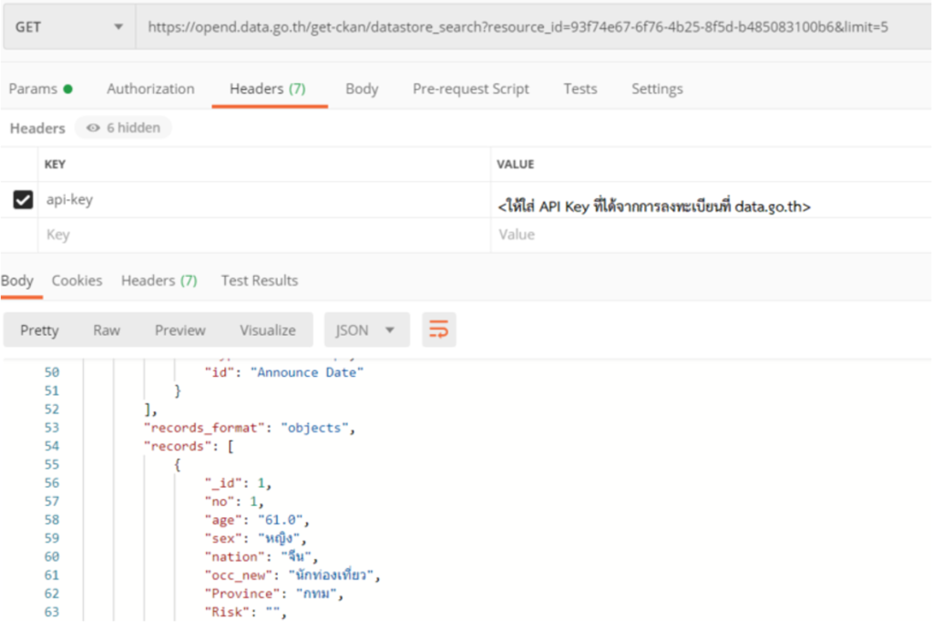 เมื่อเราได้ข้อมูลตั้งต้นแล้ว ผู้เขียนแนะนำว่าให้ใช้ Postman ในการเรียกดูข้อมูลผ่าน API ดังกล่าว เครื่องมือที่แนะนำนี้สามารถดาวน์โหลดใช้งานได้ฟรีที่ https://www.postman.com/ ซึ่งเมื่อติดตั้งเสร็จแล้วให้ทดสอบเรียก API เพื่อดึงข้อมูล แต่การเรียกข้อมูลจาก data.go.th นั้นจะต้องทำการลงทะเบียนก่อน โดยสามารถเข้าไปลงทะเบียนได้ที่ data.go.th จากนั้นท่านจะได้ API KEY สำหรับใช้ดึงข้อมูล โดยการกรอกลงในโปรแกรม Postman ดังตัวอย่างตามรูปภาพข้างล่างนี้ แล้ว API จะตอบกลับมาด้วยข้อมูลในรูปแบบ JSON (JavaScript Object Notation)