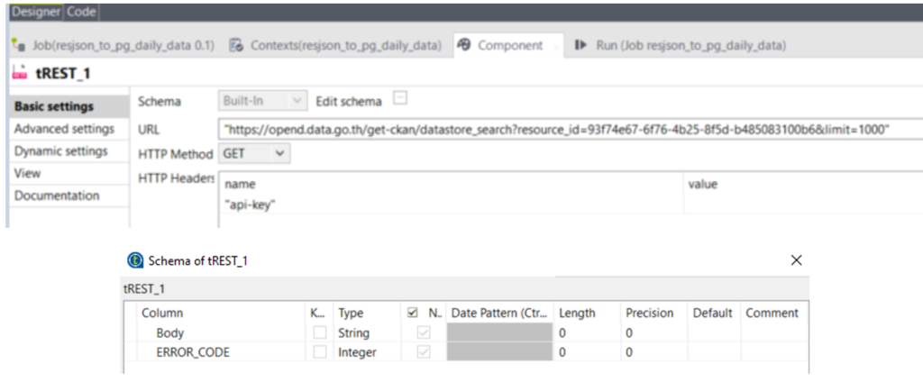 เริ่มต้นโดยการสร้าง tRest_1 และ tLogRow2 และ Config ตามรูปภาพ โดยกำหนด URL และ api-key ตามรูปโดยให้ใส่ API Key ที่ท่านผู้อ่านได้มาจาก data.go.th ซึ่งจะต้องกด Edit schema ใน tREST_1 ให้มีส่วน Body และ ERROR_CODE ตามภาพ