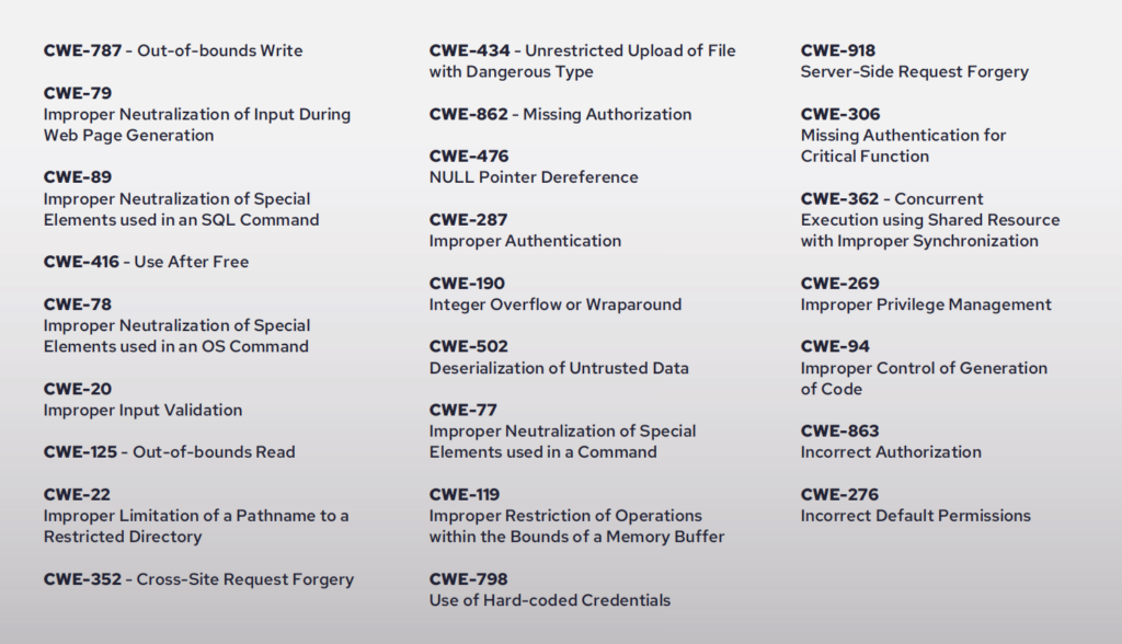 ในปี 2023 CWE Top 25 สำหรับ 10 อันดับแรก มีรายละเอียดดังต่อไปนี้ ส่วนอันดับอื่น ๆ ที่เหลือสามารถศึกษาเพิ่มเติมได้จาก Link