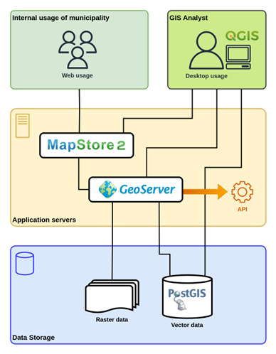 ตัวอย่างสถาปัตยกรรมของแพลตฟอร์มข้อมูลภูมิสารสนเทศ (ภาพที่ 3) ที่ใช้ซอฟต์แวร์ FOSS4G อาจประกอบด้วย