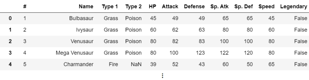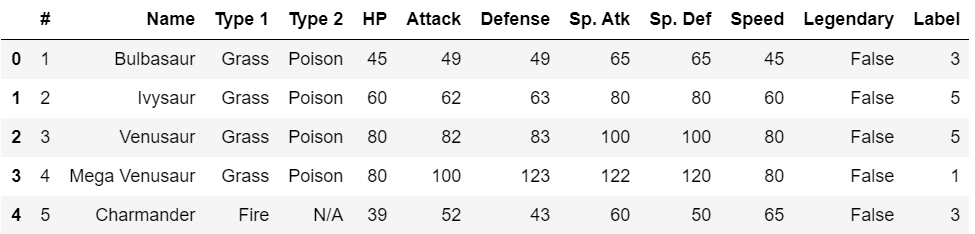 ยกตัวอย่างเช่น ต้องการแบ่งกลุ่มโปเกม่อนที่มีข้อมูลห้าแถวแรก ดังนี้