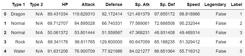 ในการแบ่งกลุ่มข้อมูลจะตัด 2 คอลัมน์แรกทิ้งไปก่อน ให้เหลือไว้เฉพาะคอลัมน์ที่แสดงถึงลักษณะของโปเกม่อนแต่ละตัว พบว่ามีใน categorical feature อยู่ 3 คอลัมน์คือ Type 1, Type 2 และ Legendary และนอกนั้นจะเป็น numerical feature ทำให้ต้องใช้ k-prototypes ในการแบ่งกลุ่มข้อมูลนี้ และจากการแบ่งกลุ่มพบว่าจำนวนกลุ่มควรเป็น 5 กลุ่ม ซึ่งจะได้ centroids ในแต่ละกลุ่ม ดังนี้
