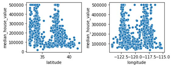 จะเห็นได้ว่าตัวแปรละติจูดและลองจิจูด นั้นไม่ได้มีความเกี่ยวข้องกับราคาบ้านที่ชัดเจน ดังนั้นเราอาจจำเป็นต้องผ่านกระบวนการอื่นเพิ่มเติมก่อนที่จะนำในการนำตัวแปรสองตัวนี้ไปใช้ประโยชน์ได้