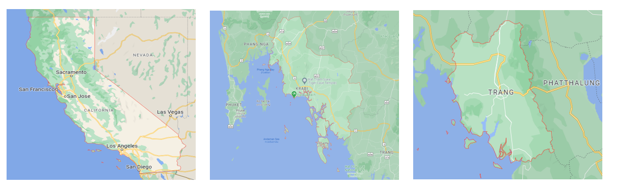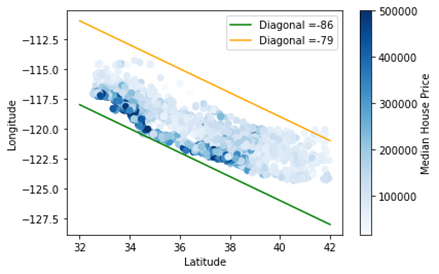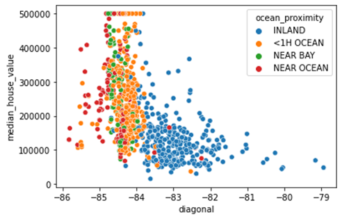 จะเห็นได้ว่า Diagonal นั้นมีความสัมพันธ์กับราคาบ้านที่ชัดเจนขึ้นและสอดคล้องกับ Label ที่ได้มาจากคอลัมน์ ocean_proximity การคำนวณ Diagonal นั้นมีข้อดีที่ใช้ง่ายและสามารถมองเห็นได้ด้วยตาเปล่า แต่อาจจะต้องปรับการใช้ตามลักษณะรูปร่างขอเมือง ในกรณีนี้สามารถใช้ได้ดีเป็นกรณีพิเศษเนื่องจากรัฐ California มีลักษณะเป็นแนวเส้นเฉียงจากซ้ายบนลงขวาล่าง (ตามรูป) โดยในประเทศไทยนั้นมีจังหวัดที่มีรูปร่างที่เหมาะกับการใช้ Diagonal ได้แก่ กระบี่, ตรัง และสตูล เป็นต้น