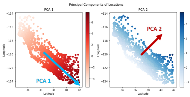 จะเห็นได้ว่าค่าของ PCA 2 ที่ได้มานั้นจะมีค่าสูงเมื่อบ้านอยู่ห่างจากชายฝั่ง และต่ำเมื่อบ้านอยู่ใกล้ชายฝั่ง จึงทำให้นำมาใช้แทน Diagonal ได้ แต่วิธีการนี้ก็ยังมีข้อจำกัดอยู่ที่ว่าสามารถใช้ได้กับเมืองที่มีลักษณะเป็นแนวเฉียงเท่านั้น ซึ่งในกรณีอื่นนั้นอาจจะนำความรู้เรื่องตำแหน่งของใจกลางเมืองมาช่วยในการสร้าง Feature เพื่อนำมาใช้ประโยชน์ได้