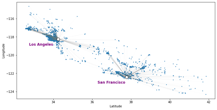 ย้อนกลับไปที่ Fig. 2 เราอาจสังเกตได้ว่าบ้านที่มีราคาสูงจะกระจุกตัวอยู่ใกล้ตัวเมือง Los Angeles และ San Francisco ซึ่งค่อนข้างสมเหตุสมผล เนื่องจากมีระยะใกล้กับสิ่งอำนวยความสะดวกและสถานที่ทำงานมากกว่า ทำให้มีความราคาแพงกว่าบ้านที่อยู่ห่างจากตัวเมือง ในกรณีนี้เราอาจจะเลือกใช้ระยะห่างจากเมืองใหญ่ถึงบ้านใช้เป็น feature ที่ใช้ในการทำนายราคาบ้านได้ โดยการคำนวณระยะทางจากพิกัดละติดจูด และ ลองจิจูด ตามหลักแล้วจะต้องใช้ฟังก์ชั่น Haversine (มีฟังก์ชั่นสำเร็จรูปใน Python – คู่มือการใช้) เพื่อการคำนวณให้แม่นยำ แต่ในกรณีนี้เราใช้เพื่อนำมาทำ Feature Engineering อาจจะไม่ต้องการความแม่นยำมาก เราอาจจะใช้สูตรพิทาโกรัส เพื่อคำนวณระยะห่างแบบง่ายๆ