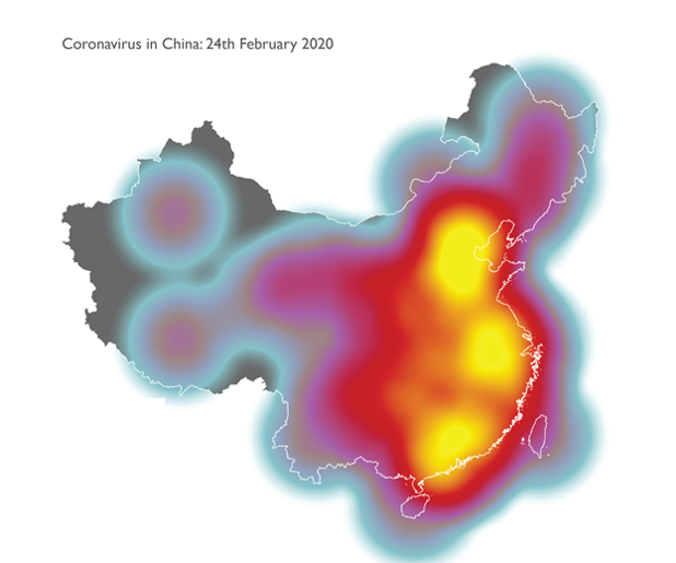 เทคนิคแรกเลยที่จะพูดถึงคือการใช้แผนที่ความร้อนหรือ heat map… ดูไม่งามเลยจริงไหมครับ แผนที่นี้สร้างโดยการประมาณค่าตัวเลขในพื้นที่ต่าง ๆ ให้ครอบคลุมทั้งประเทศ โดยใช้ค่าตั้งต้นจากผู้ป่วยในแต่ละมณฑลเป็นจุดกลางมณฑล ปัญหาคือมณฑลในจีนมีขนาดใหญ่มาก จุดกลางมณฑลที่ใช้ในการคำนวณอาจจะไม่ใช่จุดกึ่งกลางของการระบาดในมณฑลนั้น ๆ อีกอย่างหนึ่งคือเราดูแผนที่นี้แล้วดูไม่ออกว่าจุดเริ่มต้นของการระบาดอยู่ที่หูเป่ย ส่วนสีที่ใช้นั้นก็ดูไม่ค่อยสื่อถึงกับการระบาดของโรคเท่าไร