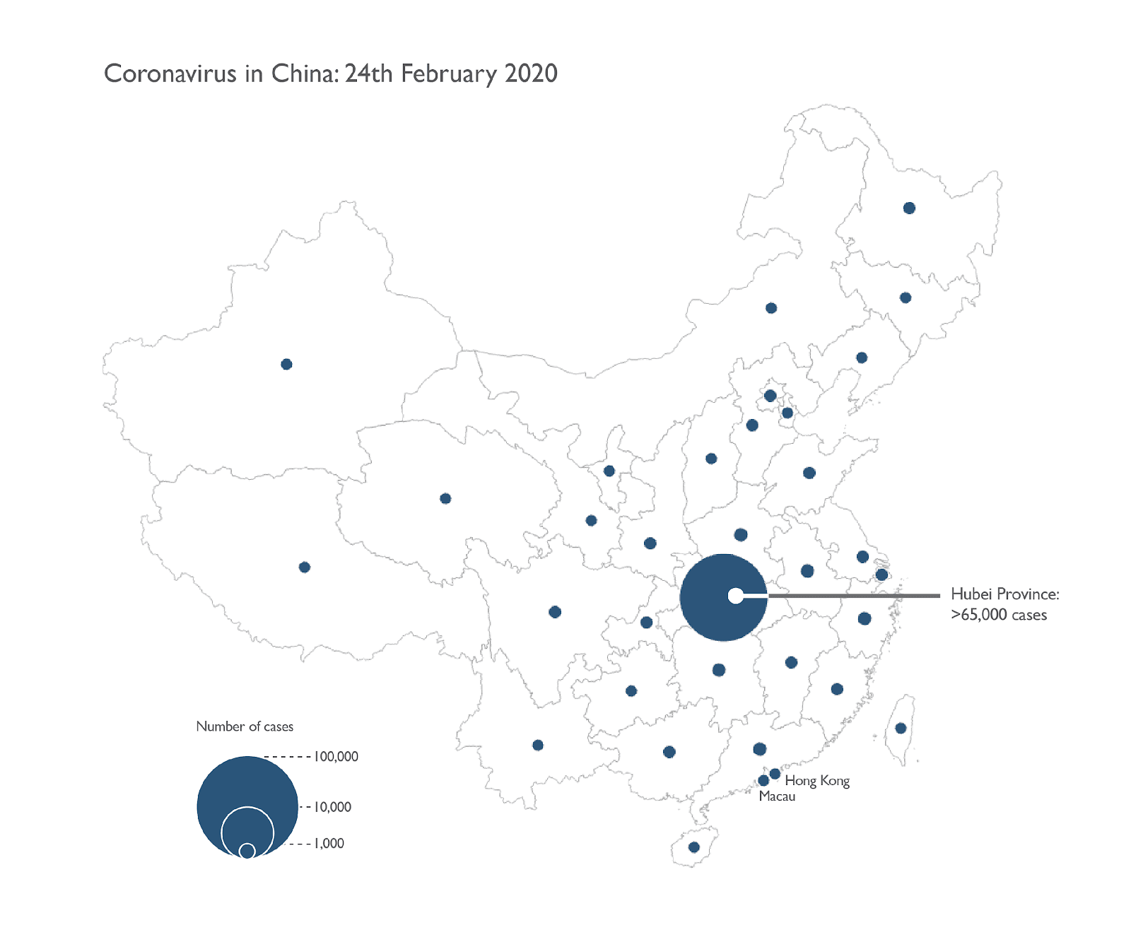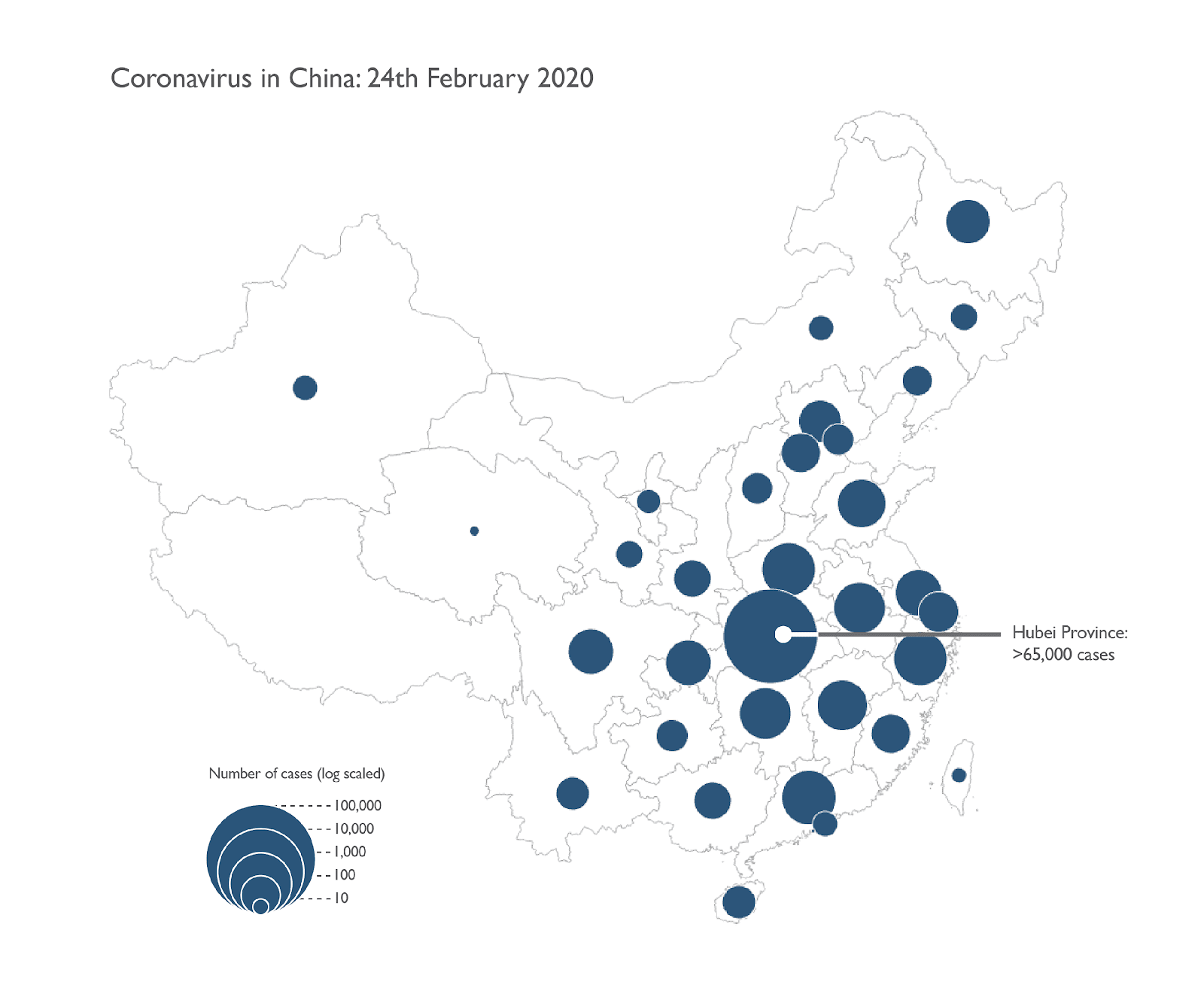 เนื่องจากหูเป่ยมีตัวเลขผู้ป่วยสูงจุดอื่น ๆ จึงมีขนาดเล็กหมด เราสามารถแก้ปัญหานี้ได้โดยใช้อัตราส่วนแบบ logarithm หรือที่เรียกกันว่า log scale ในการแสดงขนาดของจุด จะทำให้เปรียบเทียบมณฑลอื่น ๆ ได้ง่ายยิ่งขึ้น แต่อย่าลืม legend ที่ชัดเจนเพื่อบอกว่าขนาดของวงกลมหมายถึงอะไร