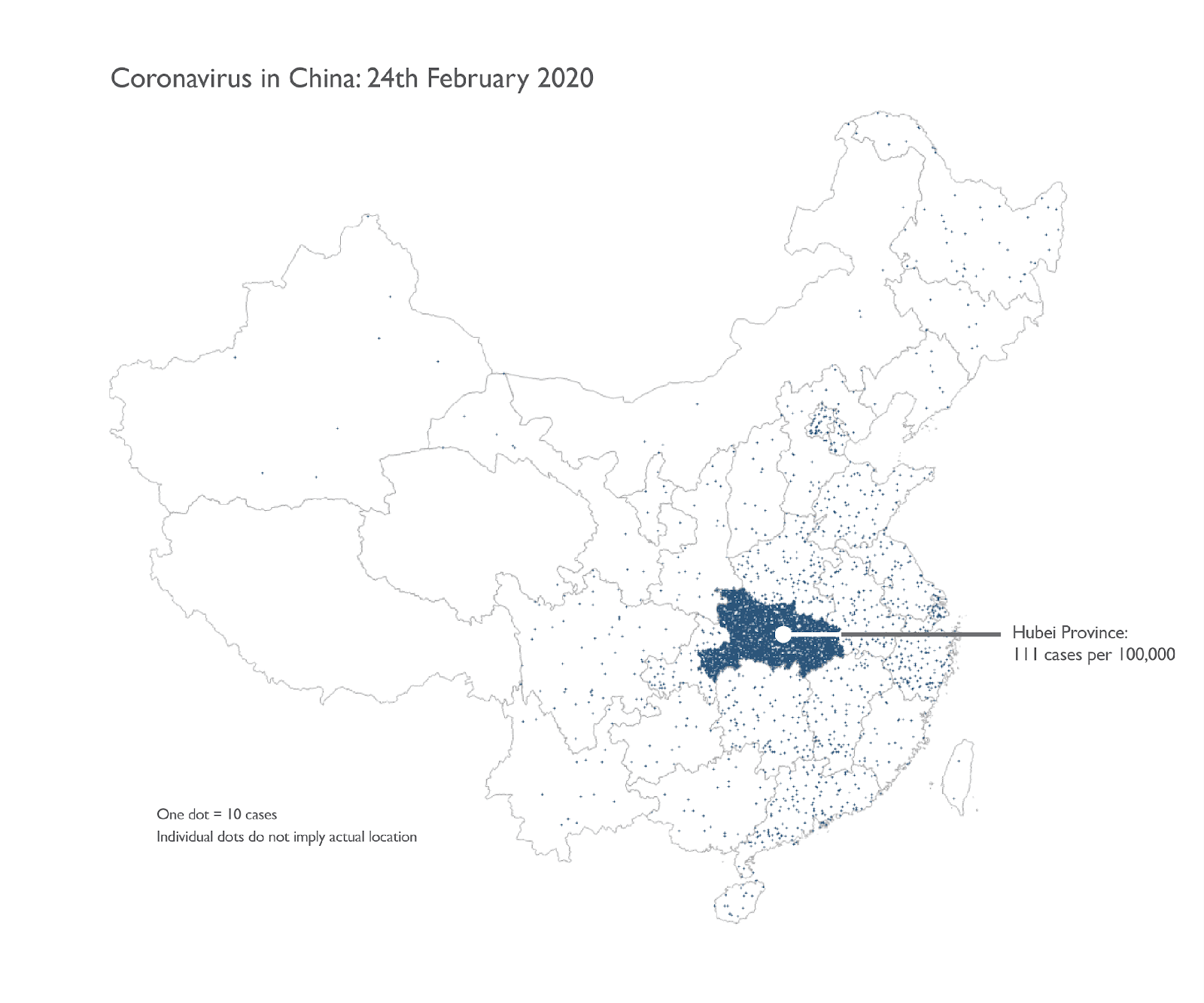 เราสามารถใช้แผนที่แบบจุดกระจาย หรือ dot density map แทนการใช้สีเพื่อแสดงข้อมูลผู้ป่วยได้ โดยในรูปที่ 4 แต่ละจุดในภาพสื่อถึงผู้ป่วยสิบคน การใช้จุดทำให้เราสามารถนำเสนอจำนวนผู้ป่วยทั้งหมดได้เลย ไม่ต้องทำอัตราส่วนก่อน เพราะจุดแต่ละจุดนั้นมีขนาดเท่ากันจะไม่ทำให้เกิดการตีความผิดแบบในกรณีใช้สี เนื่องจากเราไม่รู้ตำแหน่งทีแท้จริงของผู้ป่วยจึงให้จุดจะกระจายแบบสุ่มในแต่ละพื้นที่ ซึ่งแสดงให้เห็นถึงความแตกต่างที่ชัดเจนระหว่างหูเป่ยและมณฑลอื่น ๆ ข้อเสียคือทำให้คนอ่านเข้าใจผิดว่าแต่ละจุดหมายถึงผู้ป่วยหนึ่งคน ดังนั้นการใส่ label ที่เหมาะสมจึงมีความจำเป็น