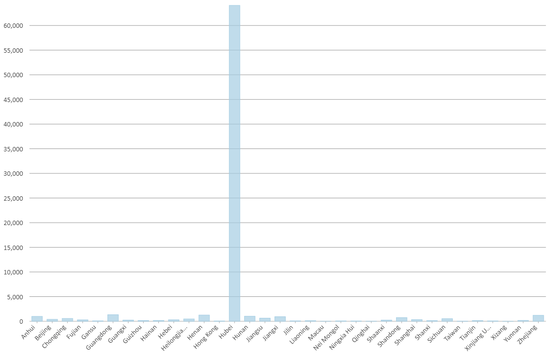 อีกอย่างหนึ่งที่ต้องคำนึงถึงเมื่อใช้ choropleth mapping ก็คือ color scheme หรือ เกณฑ์ในการใช้สี ในรูปที่ 1 นี้มีการใช้จำนวนผู้ป่วย 1000 คนเป็นค่าสูงสุดและให้เป็นสีเข้มที่สุด ซึ่งมีอยู่ห้ามณฑลด้วยกัน ถ้าดูแผนที่นี้อย่างเผิน ๆ อาจเข้าใจว่าห้ามณฑลนี้มาการระบาดพอ ๆ กัน ใช่ไหมครับ… ผิดครับ ลองมาดูกราฟจะเห็นได้ว่าหูเป่ยมีปริมาณสูงกว่าอีกสี่มณฑลมาก ถ้าดูกราฟแท่งนี้แล้วกลับไปมองแผนที่ในรูป 1 จะพบว่ามันสื่อความหมายต่างกันสิ้นเชิง ซึ่งเป็นเพราะว่าการใช้ 1000 เคสผู้ป่วยเป็นตัวแบ่งสีนั้นอาจจะไม่ใช่ทางเลือกที่ดีนัก