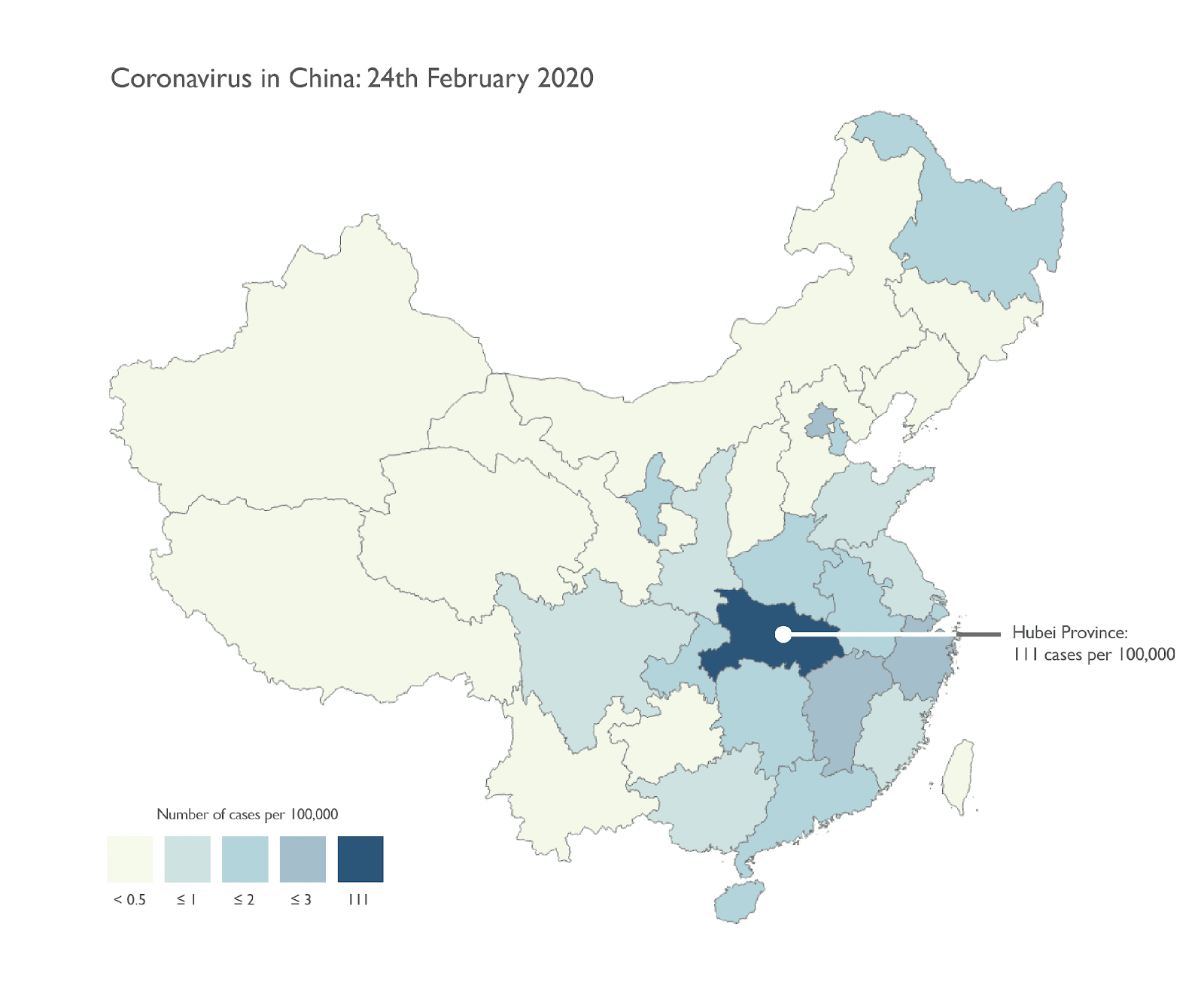 อย่างที่สามหูเป่ยมีผู้ติดเชื้อ 111 คนต่อแสนคน ในขณะที่มณฑลอื่นมีไม่ถึง 3 คนต่อแสนคน จึงใช้สีที่ต่างจากมณฑลอื่นอย่างเห็นได้ชัด ซึ่งแสดงให้เห็นถึงความแตกต่างที่ชัดเจนยิ่งขึ้น การใส่ label และ legend ที่เหมาะสมก็ช่วยให้ตีความข้อมูลได้ถูกต้องมากขึ้น