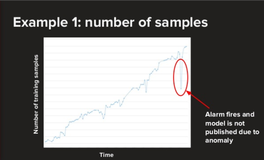 จากภาพจะเห็นได้ชัดว่า จำนวนตัวอย่างที่ใช้ Train ตกลงจนผิดปกติในบริเวณที่วงสีแดงไว้ เมื่อเกิดเหตุเช่นนี้ระบบ Anomaly Detection ของเน็ตฟลิกซ์จะส่งสัญญาณเตือนและหยุดการเผยแพร่ (Publish) ไว้ก่อน นอกจากตัวอย่างนี้แล้วยังมีตัวอย่างอื่นอีกมากมายในส่วนของการ Training ในฝั่งออฟไลน์ เช่น การ Train โมเดลจากการสุ่มที่หลากหลาย เพื่อป้องกันการ Overfit