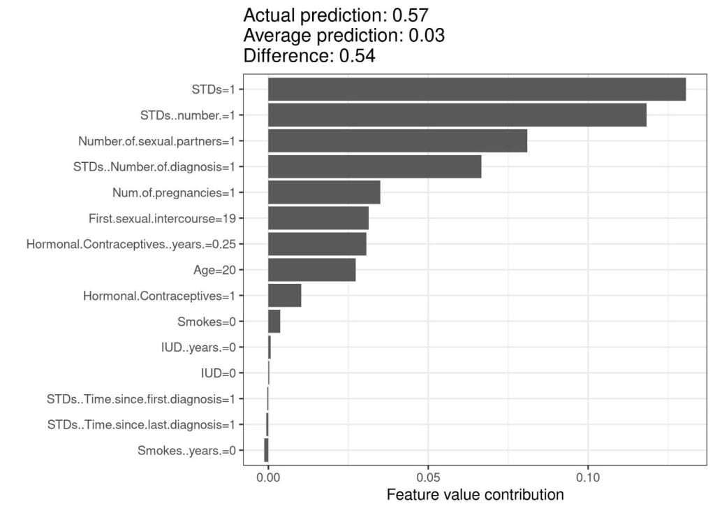 ภาพด้านบนแสดง Shapley value อิงจากค่าฟีเจอร์ของผู้หญิงคนหนึ่ง จากชุดข้อมูลมะเร็งปากมดลูก (cervical cancer dataset) ซึ่งโมเดลทำนายความน่าจะเป็นของการเป็นมะเร็งปากมดลูกอยู่ที่ 0.57 สูงกว่าความน่าจะเป็นเฉลี่ยจากข้อมูลทั้งชุดที่ 0.03 คิดเป็นผลต่างความน่าจะเป็น 0.54 โดยจากการวิเคราะห์พบว่าค่าฟีเจอร์ว่าด้วยการมีโรคติดต่อทางเพศสัมพันธ์ (STDs) ส่งผลต่อการเพิ่มขึ้นของค่าความน่าจะเป็นมากที่สุด จากภาพจะเห็นว่าผลรวมของค่าผลกระทบขตัวอย่างการใช้งานกับโจทย์ประเภท classificationองทุกค่าฟีเจอร์มีค่าเท่ากับผลต่างระหว่างค่าทำนายกับค่าทำนายเฉลี่ยจากข้อมูลทั้งชุด (0.54).